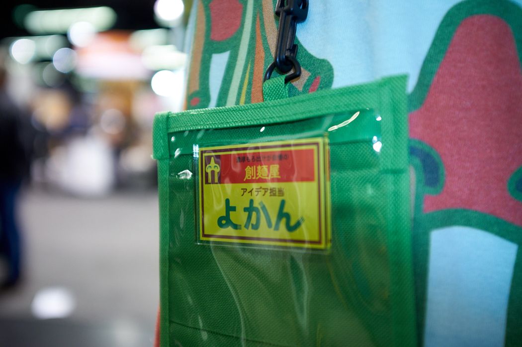 麺型の文字と、スーパーで見る店員のバッジを参考にしたデザインです。